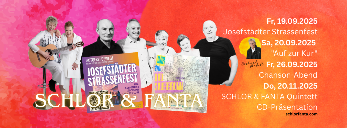 Andrea Schlor und Saskia Fanta haben zwar den „Damenspitz“ abgelegt, aber ruhiger ist es um sie nicht geworden. Als „Schlor & Fanta“ begeistern und verzaubern sie das Publikum. Zusammen mit ihrem Freund und Texter, dem renommierten Schriftsteller Gerhard Blaboll, hat das charmante Damenduo erst heuer Auftragsarbeiten wie die neue offizielle „Landstraßer Hymne“, drei Titel zur Sonder-Ausstellungseröffnung im burgenländischen „MUBA - Museum für Baukultur“ und ein Lied zum über 100jährigen Bestehen von Bad Sauerbrunn als Kurort, das zugleich 40 Jahre „Sonnberghof“ feiert, veröffentlicht.
